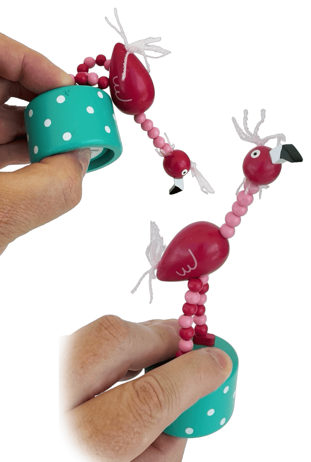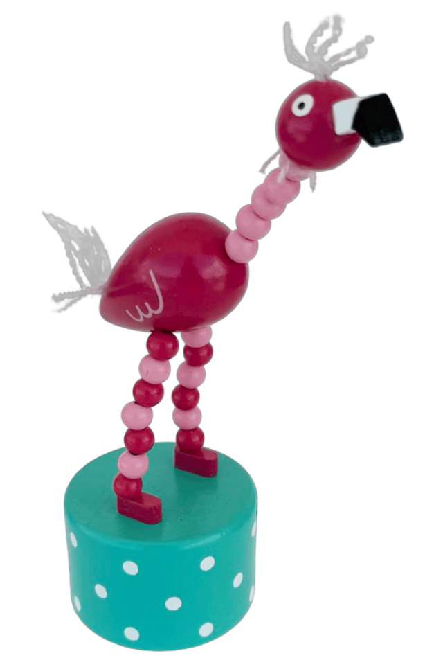 Pink Flamingo Wooden Thumb Push Puppet Toy : Push the base of our Cute Pink Flamingo to make him dance! Our classic wooden push puppet is purple, pink and white with a soft tail. Just push your thumb under his green dotted base to make him wiggle and collapse. Release your thumb or finger and the magic bird pops upright again. Collect all of our exotic bird Push Puppet toys and put on a puppet show!