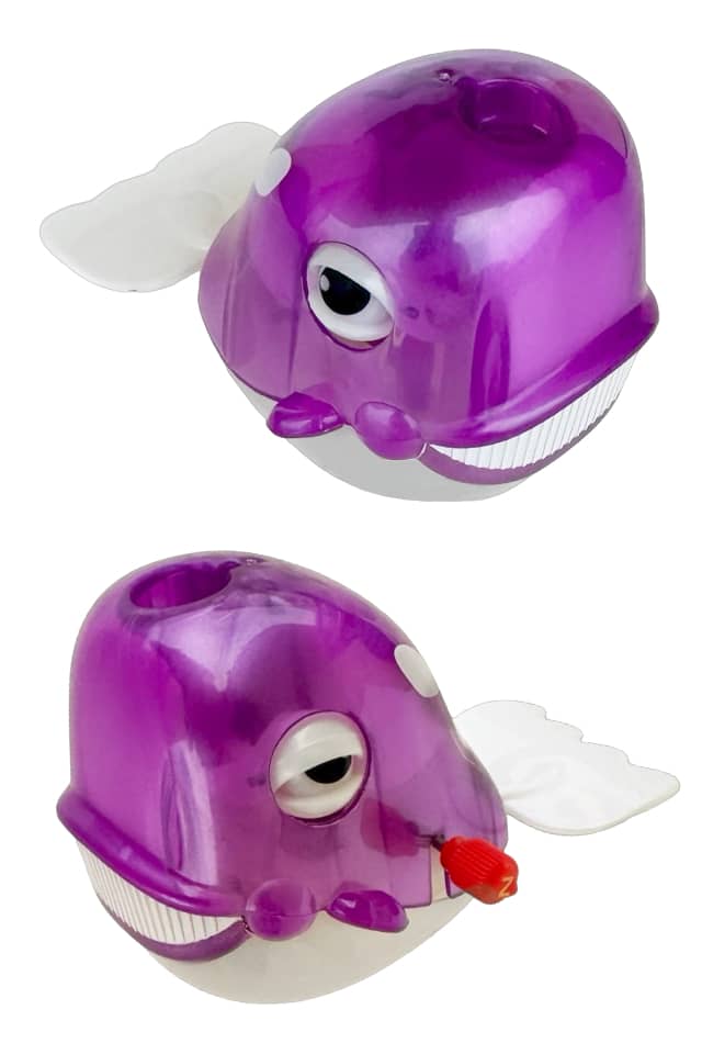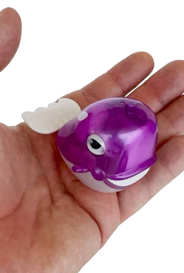 Wilbur the Purple Whale Windup : Swims Spouts Blinks : Our happy Wilbur Whale features blinking eyes, a flapping tail and a real water squirting blow hole! Just wind up our adorable purple whale in a pool of water and he will swim and spray. Our Wilbur the Whale has a blue and white translucent plastic body with shiny tail and translucent eyelids. Wilbur is a windup original from California Creations and Tomy. Collect all our funny animated ZWindUps!