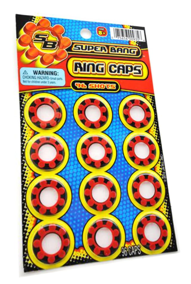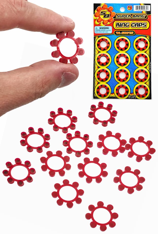 96 shots for our 8 shot Ring Cap Guns. Our Super Bang red ring caps are super loud! You get 12 red rings with 8 shots on each load for a total of 96 shots. These refills are for the 8 shot ring cap guns. You can also pop these caps apart for use in single shot cap guns and cap bombs.