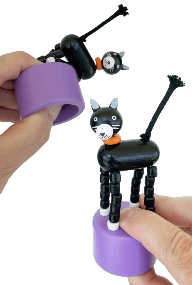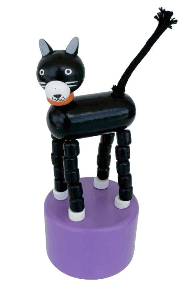 Black Cat Halloween Wooden Thumb Push Puppet Toy : Push the base of our cute Black Cat to make her come to life! Our classic wooden push puppet is black and purple with a soft tail. Just push your thumb under her purple base to make her dance, wiggle and collapse. Release your thumb or finger and the Halloween monster pops upright again. Collect all of our Halloween Push Puppet toys and put on a puppet show!