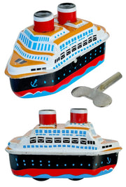 Classic Cruise Ship Tin Toy celebrates classic transcontinental ships as a mini windup tin toy. The metal ship features 2 red funnels, multiple decks, and life rafts. Just wind up the colorful mini ship with its enclosed metal key to watch the ship cruise forward on its 4 wheels. The classic ship looks like a White Star, Cunard, or Disney Cruise Line ship. Remember a special ocean vacation and share this vintage wind up tin toy boat. Celebrate your upcoming cruise or give a gift to your favorite cruise lover!
