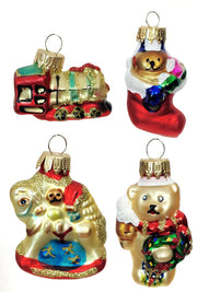Type: Four Mini Classic Toy Glass Ornaments - Gold String Attached