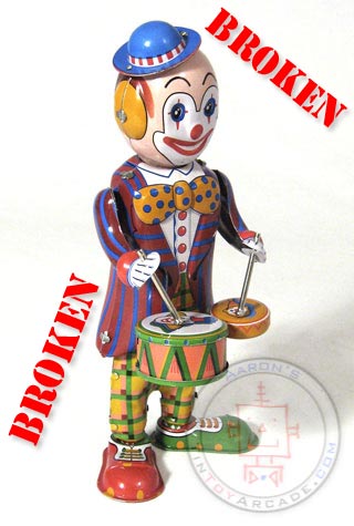 Our colorful Drumming Clown wiggles his upper body back and forth while he happliy bangs on his drums. This colorful tin clown comes with an attached key. Wind him up and let the drumming begin. A high quality classic tin collectors toy!