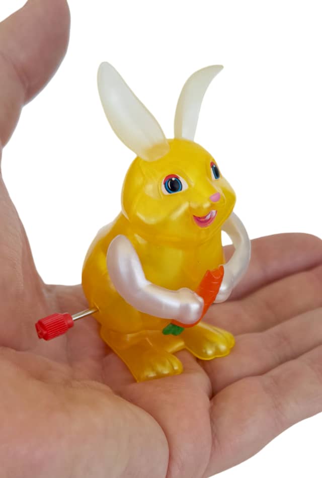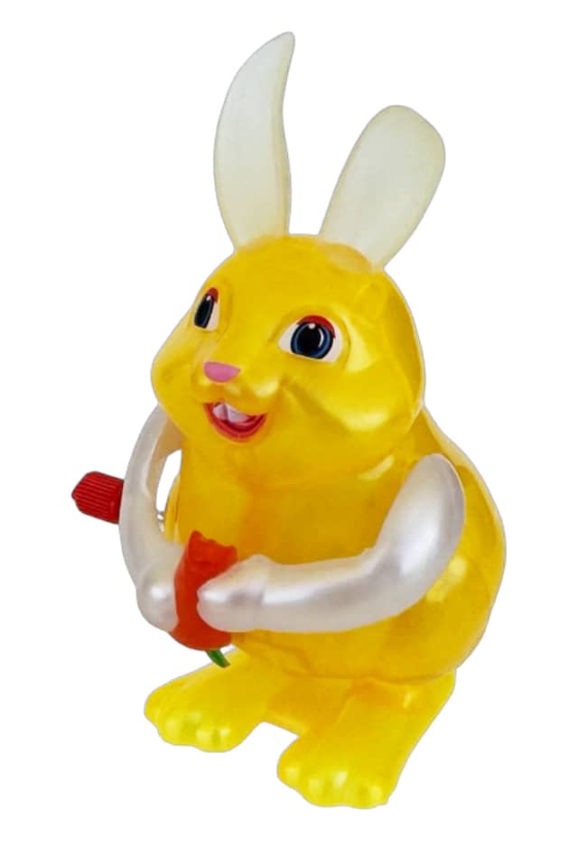 Our amazing Megan the Bunny munches on her carrot and then she hops away. She eats and hops over and over again. This complex wind up bunny rabbit is a translucent yellow plastic Z Windups original by California Creations.