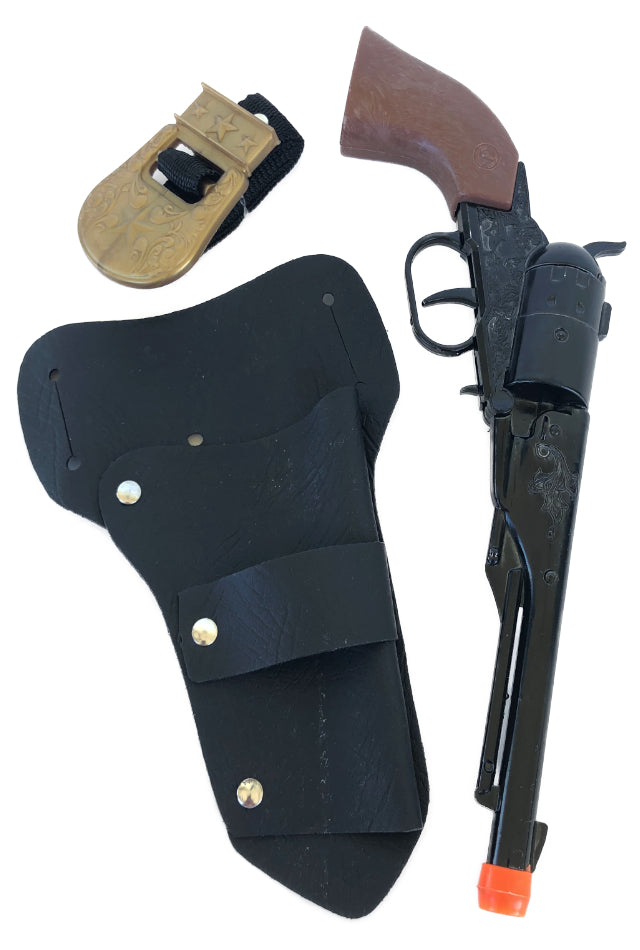 The star adorned gold belt buckle, black holster, simulated wood handle and red tip are all safe plastic. Imagine that you are running from the law in the Tombstone Arizona!